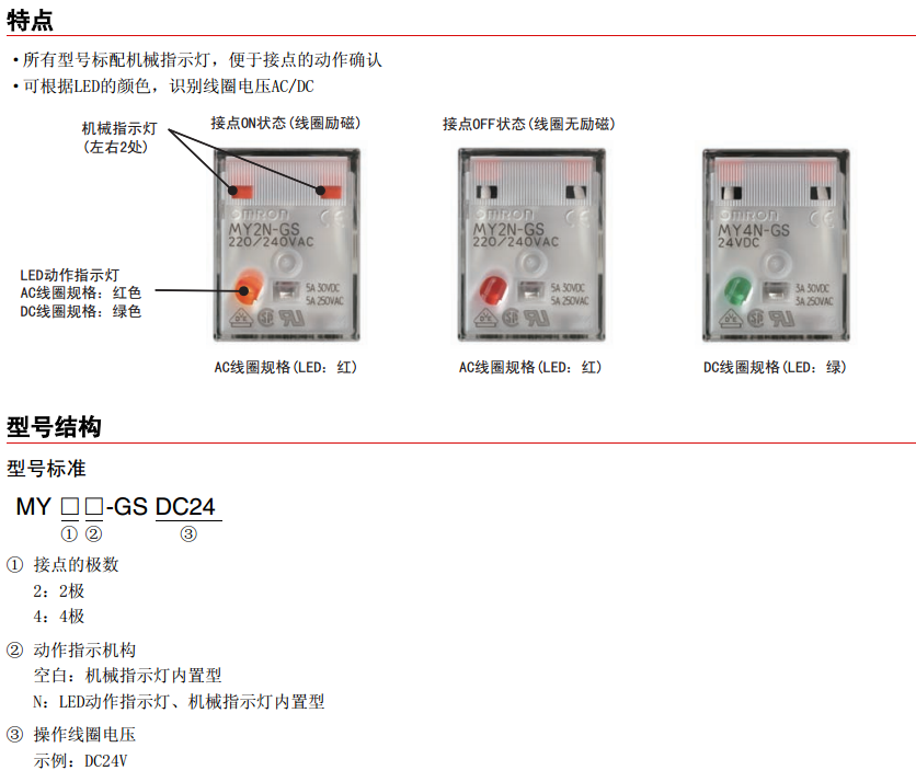根據LED動作指示燈的顏色,可識別AC線圈規(guī)格、DC線圈規(guī)格